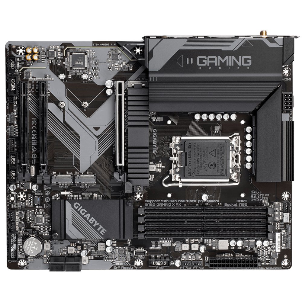 Gigabyte B760 GAMING X AX. Processorfabrikant: Intel, Processor socket: LGA 1700, Compatibele processors: Intel® Celeron®, Intel® Core™ i3, Intel® Core™ i5, Intel® Core™ i7, Intel® Core™ i9,…. Ondersteunde geheugen types: DDR5-SDRAM, Maximum intern geheugen: 128 GB, Geheugen slots type: DIMM. Ondersteunde opslagstationinterfaces: M.2, PCI Express 4.0, SATA III, Ondersteunde types opslag-drives: HDD & SSD, Soorten RAID: 0, 1, 5, 10. Maximum resolutie: 4096 x 2304 Pixels. USB-connectortype: USB Type-A, USB Type-C